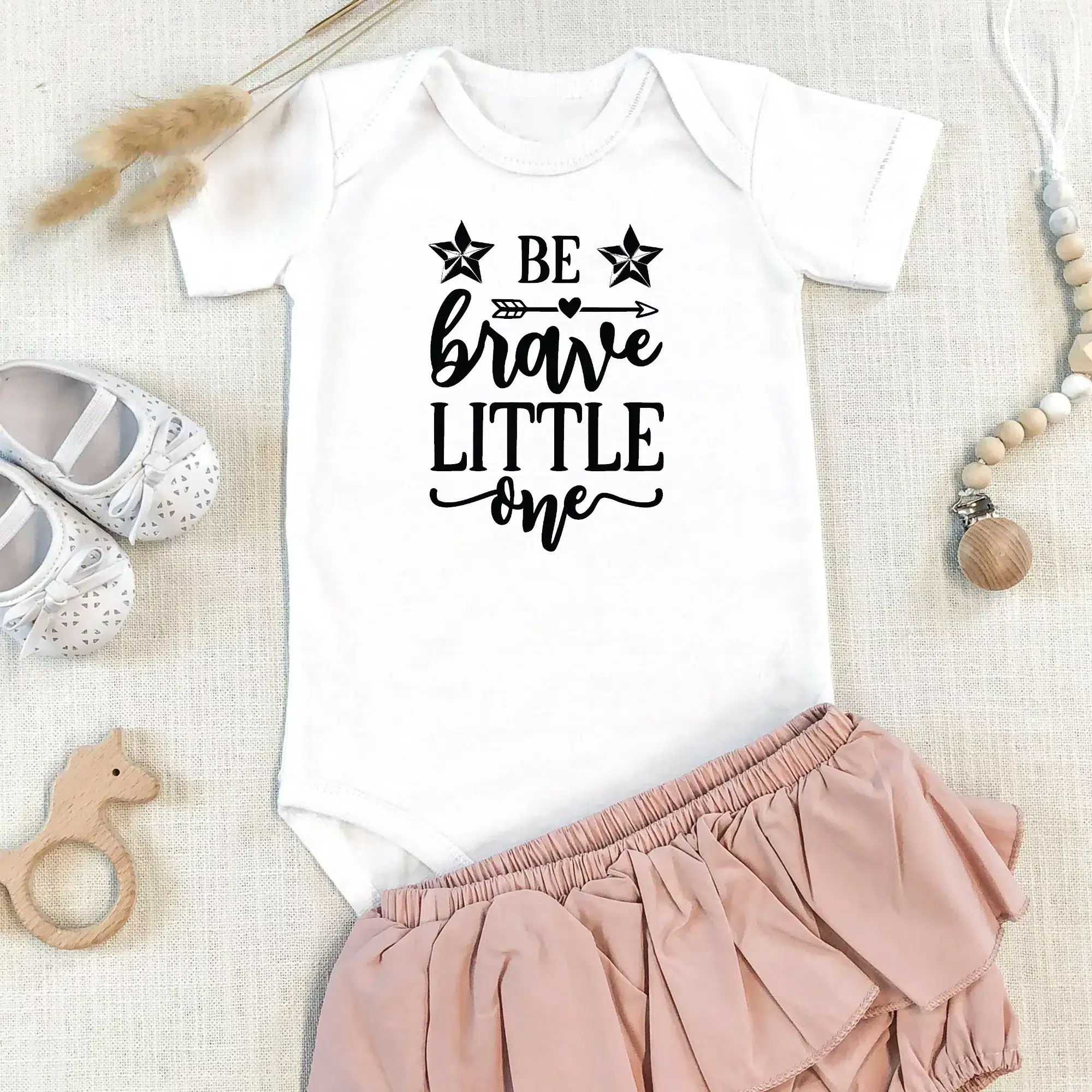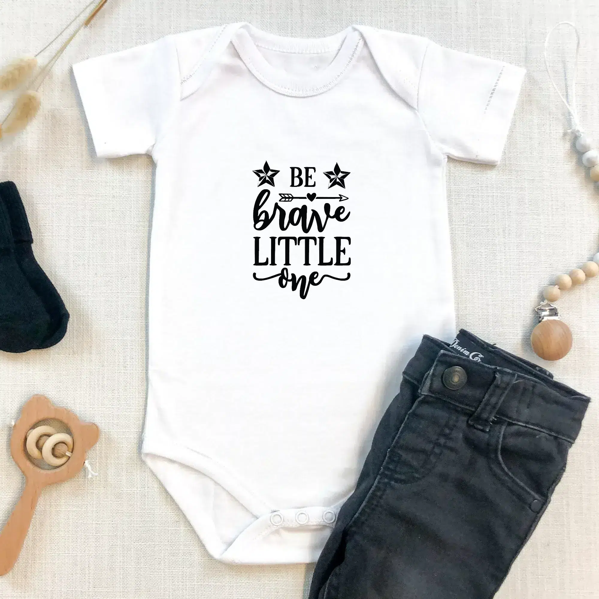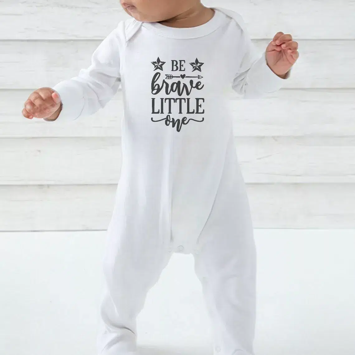 Embrace the simplicity and charm of our ‘Be Brave Little One’ Babygrow – The perfect blend of style, comfort, and practicality for your little bundle of joy.