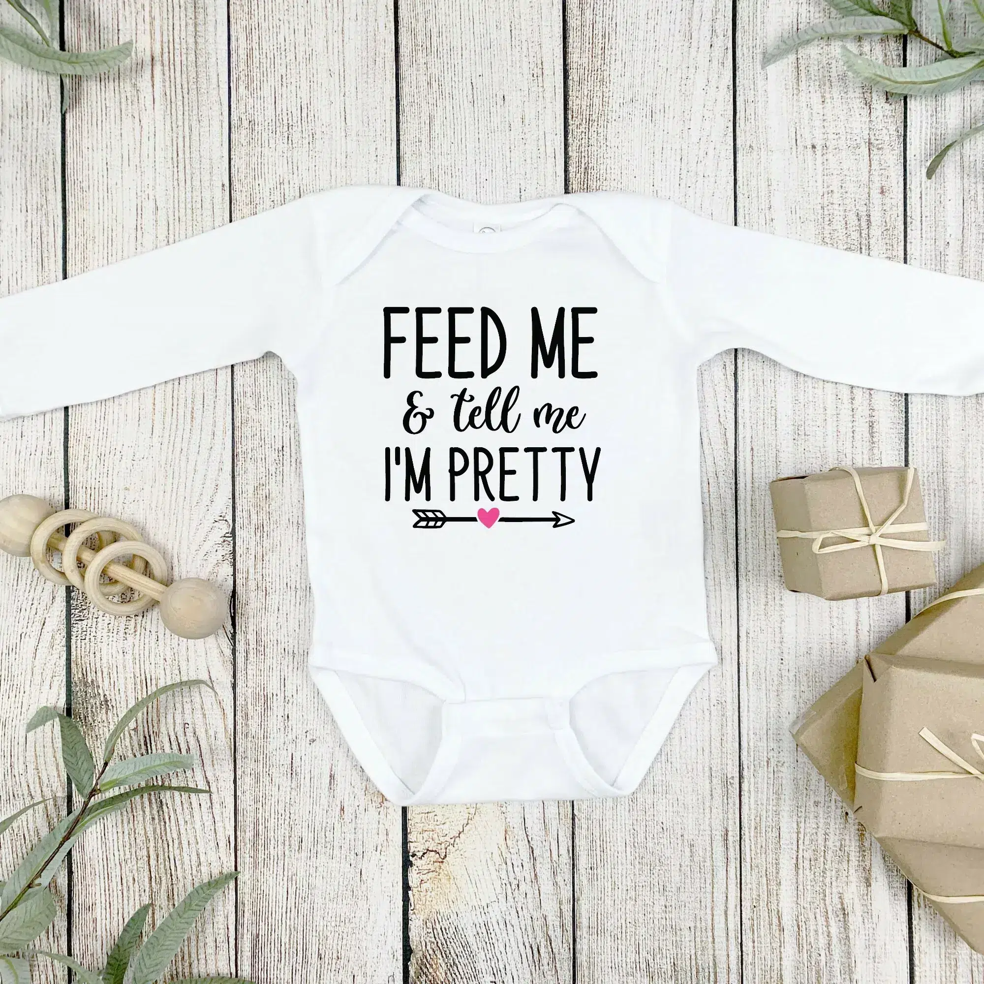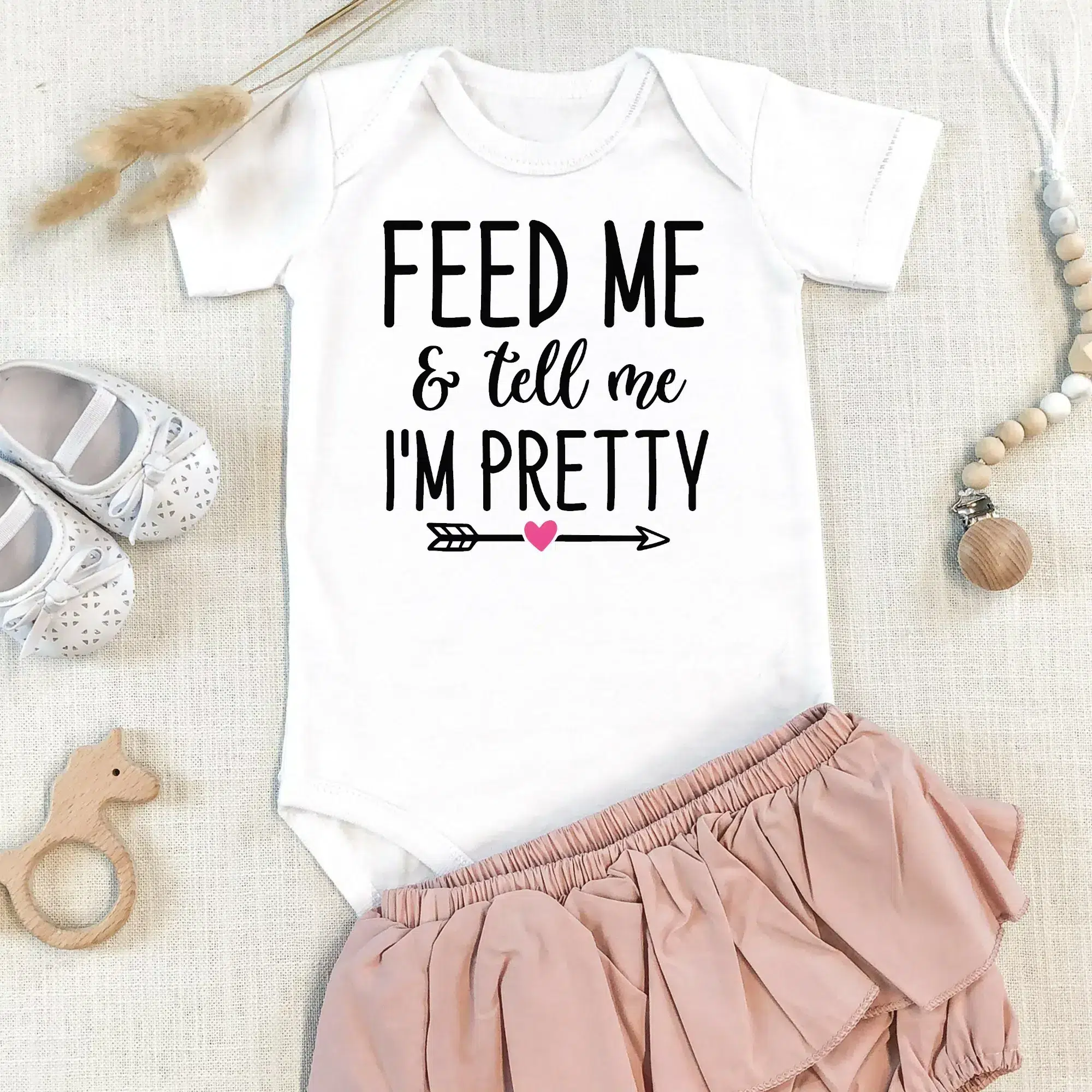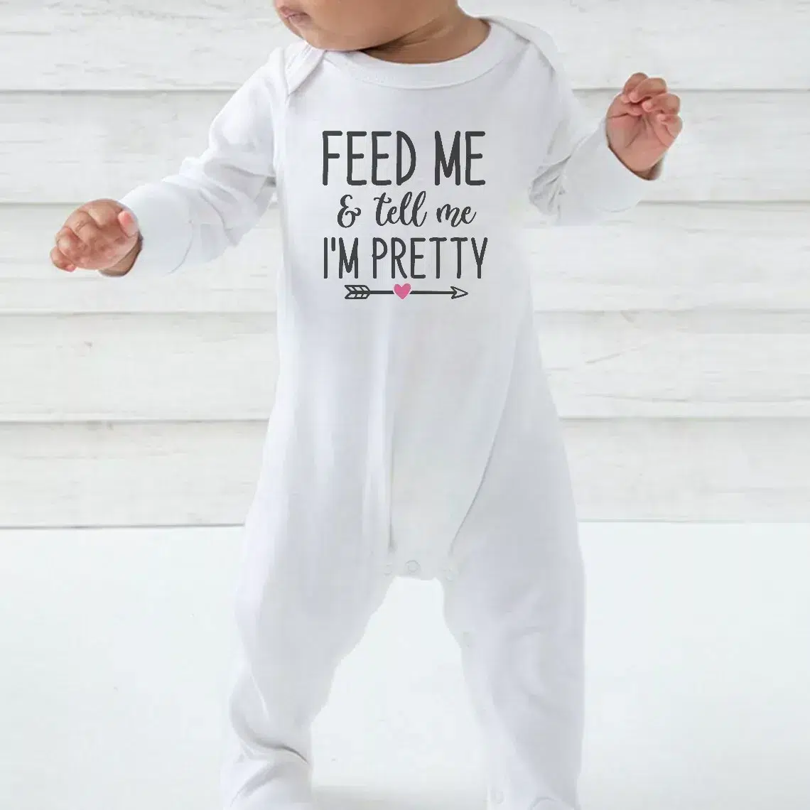 Embrace the simplicity and charm of our ‘Feed Me & Tell me I’m Pretty’ Babygrow – The perfect blend of style, comfort, and practicality for your little bundle of joy.