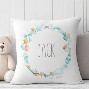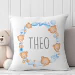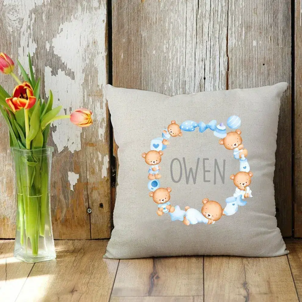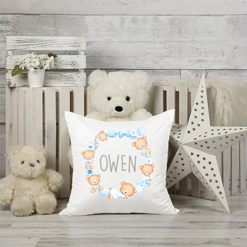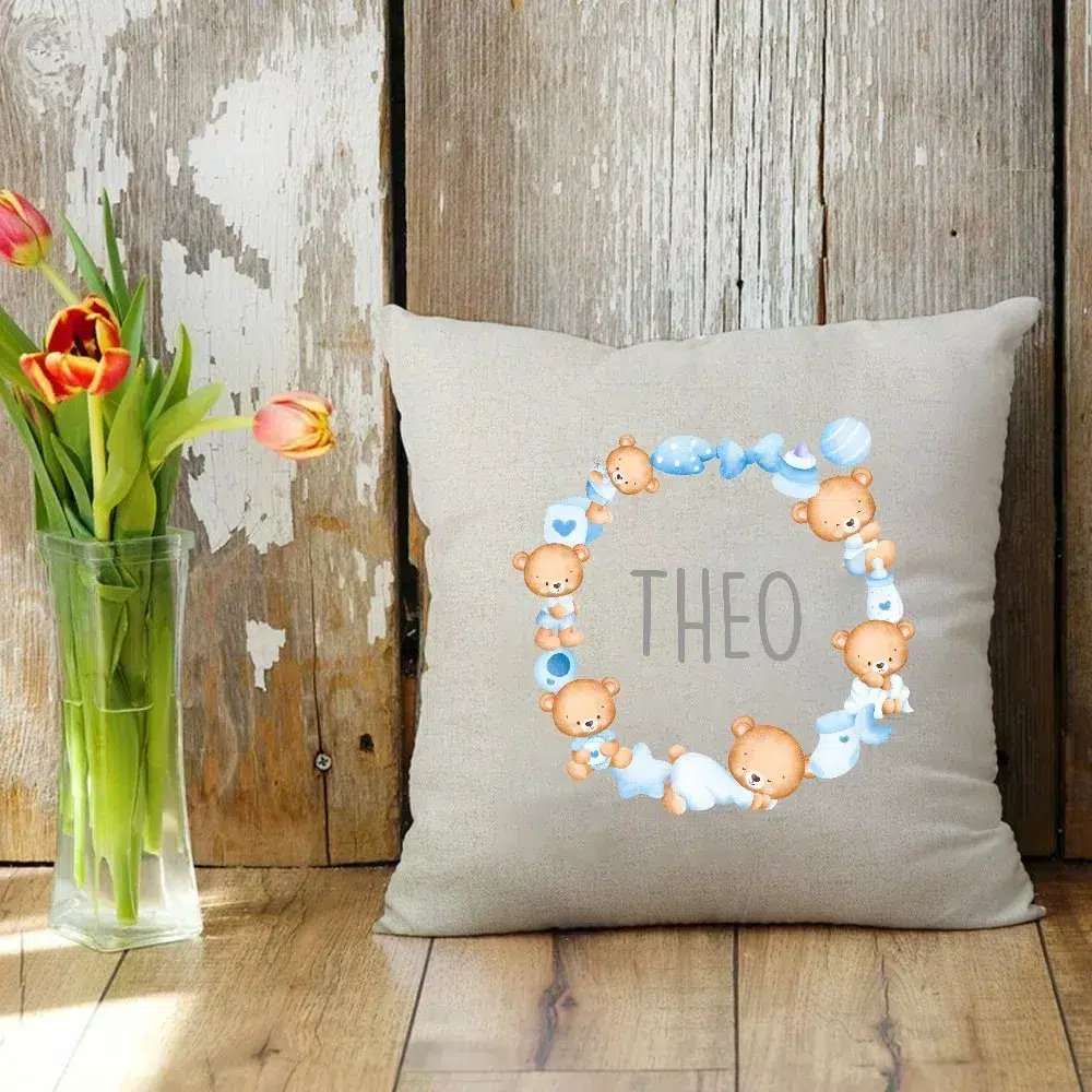 Hand Made With Love – Personalised Baby Boy Teddy Wreath Cushion