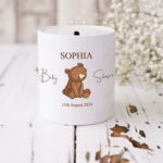 Celebrate the joy of new beginnings with our Personalised Baby Shower Money Pot, a delightful keepsake designed to collect donations for Baby and their bright future. This charming money box features an adorable image of a Brown Baby Bear, making it a heartwarming addition to any nursery or home decor.