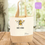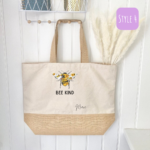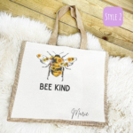 Make a statement for the planet without compromising on style. Choose the Reusable Personalised ‘Bee Kind’ Shopping Bag that resonates with your personality, and take it a step further by personalising it with your name, a special message, or unique design. Contribute to a greener, cleaner future while showcasing your individuality with our jute and polyester blend bags – the perfect harmony of style, durability, and environmental responsibility.