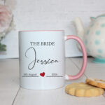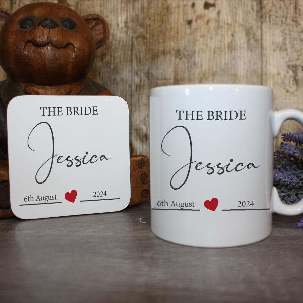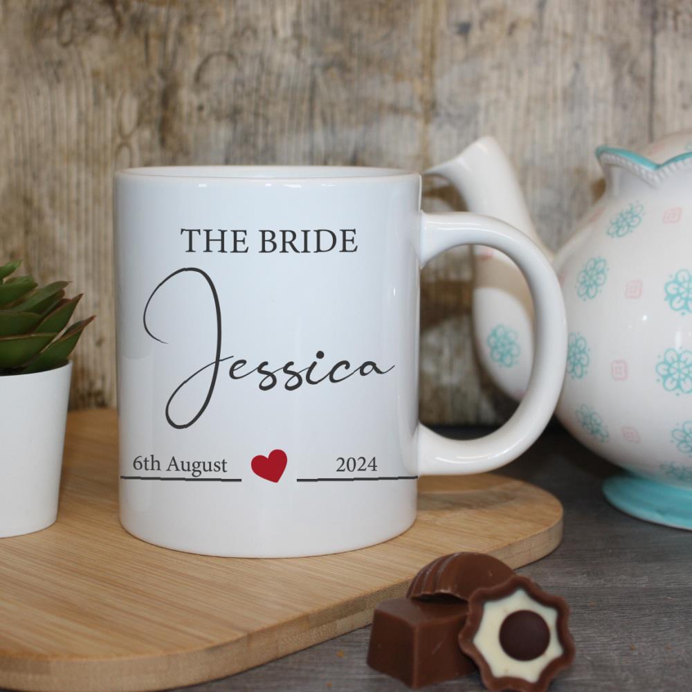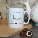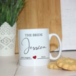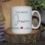 Celebrate the special day with our stunning personalised “Bride Mug with Heart”, a perfect wedding keepsake and memory gift. This elegant custom mug is designed to commemorate the joyous occasion, featuring the words “The Bride” in a stylish font. Below, there is ample space to add the bride’s name and the wedding date, creating a truly unique and cherished item.