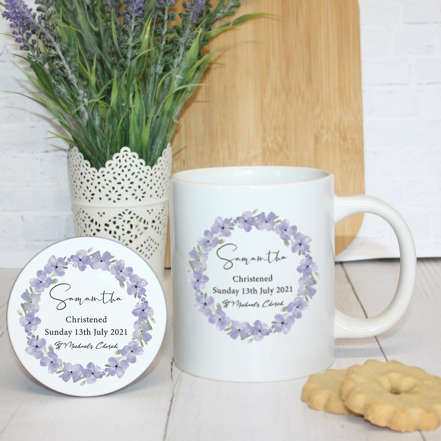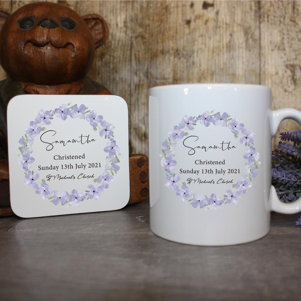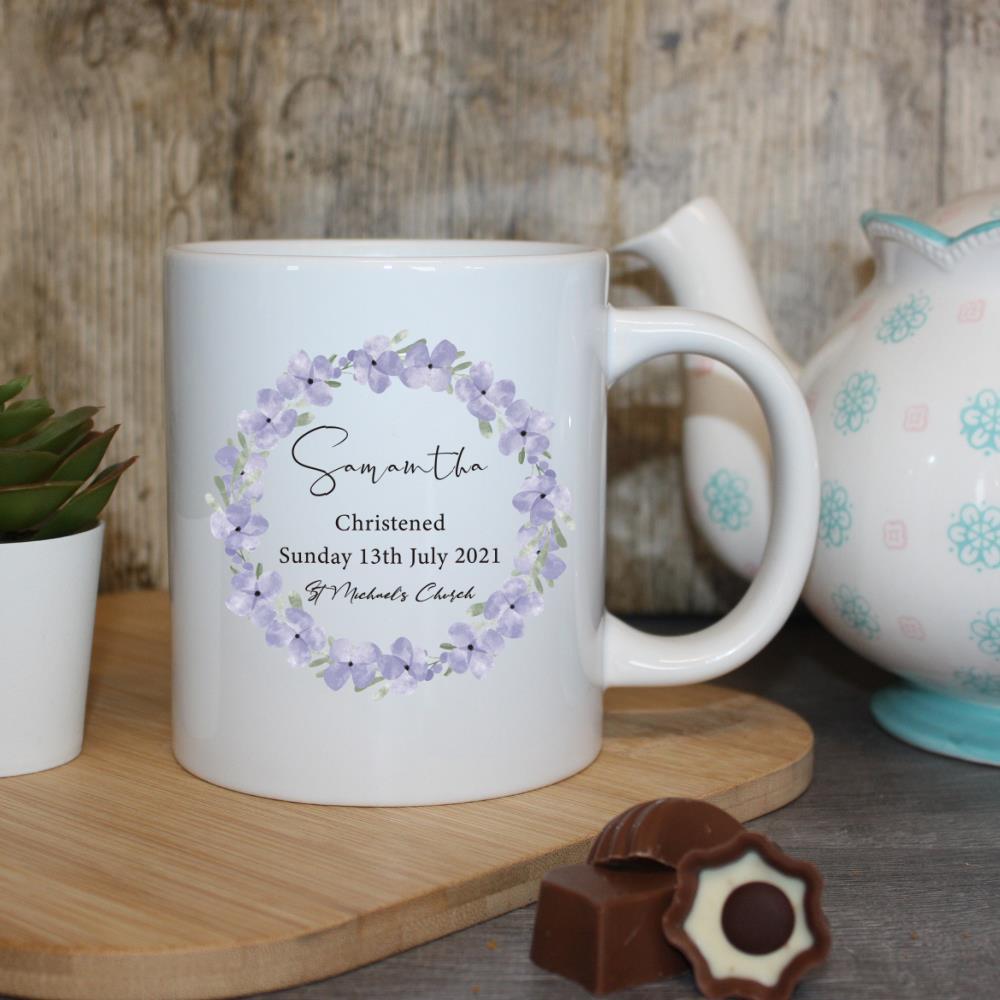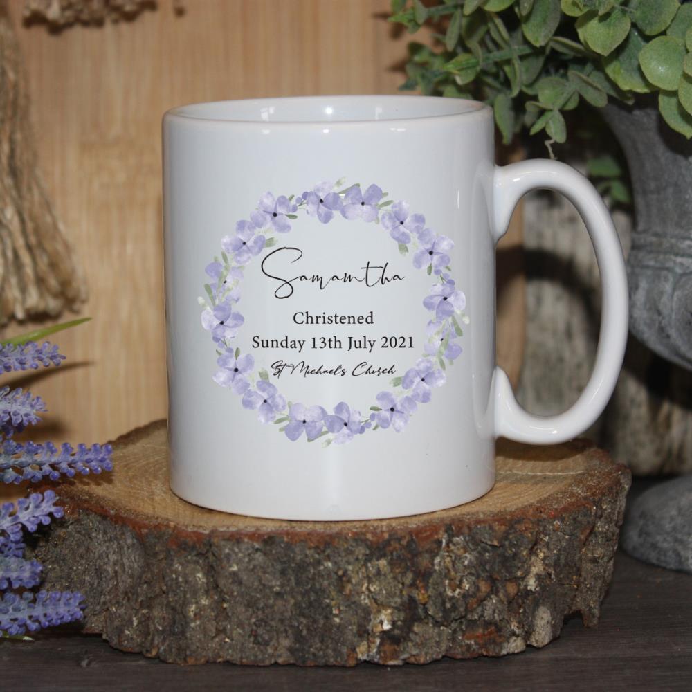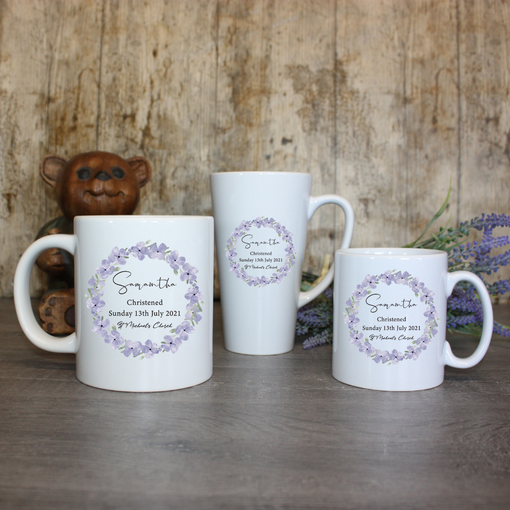 Celebrate the joyous occasion of a christening with our beautifully crafted Christening Mug adorned with a delicate wreath of purple flowers. This exquisite mug serves as a perfect keepsake for the little one’s special day.