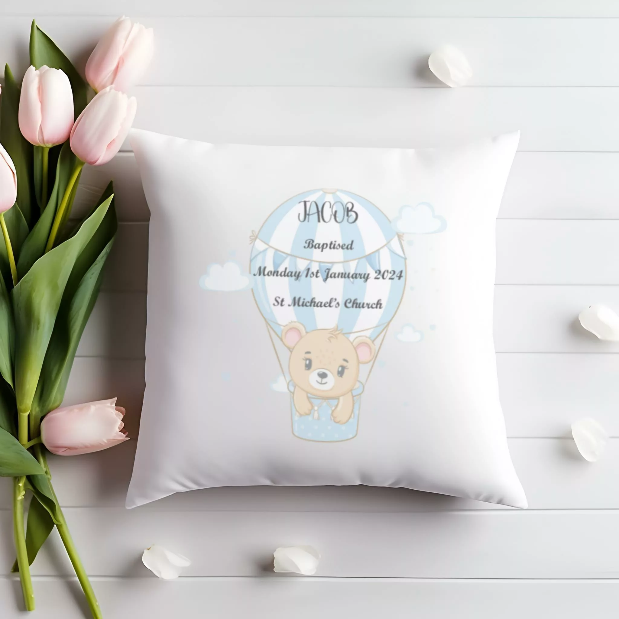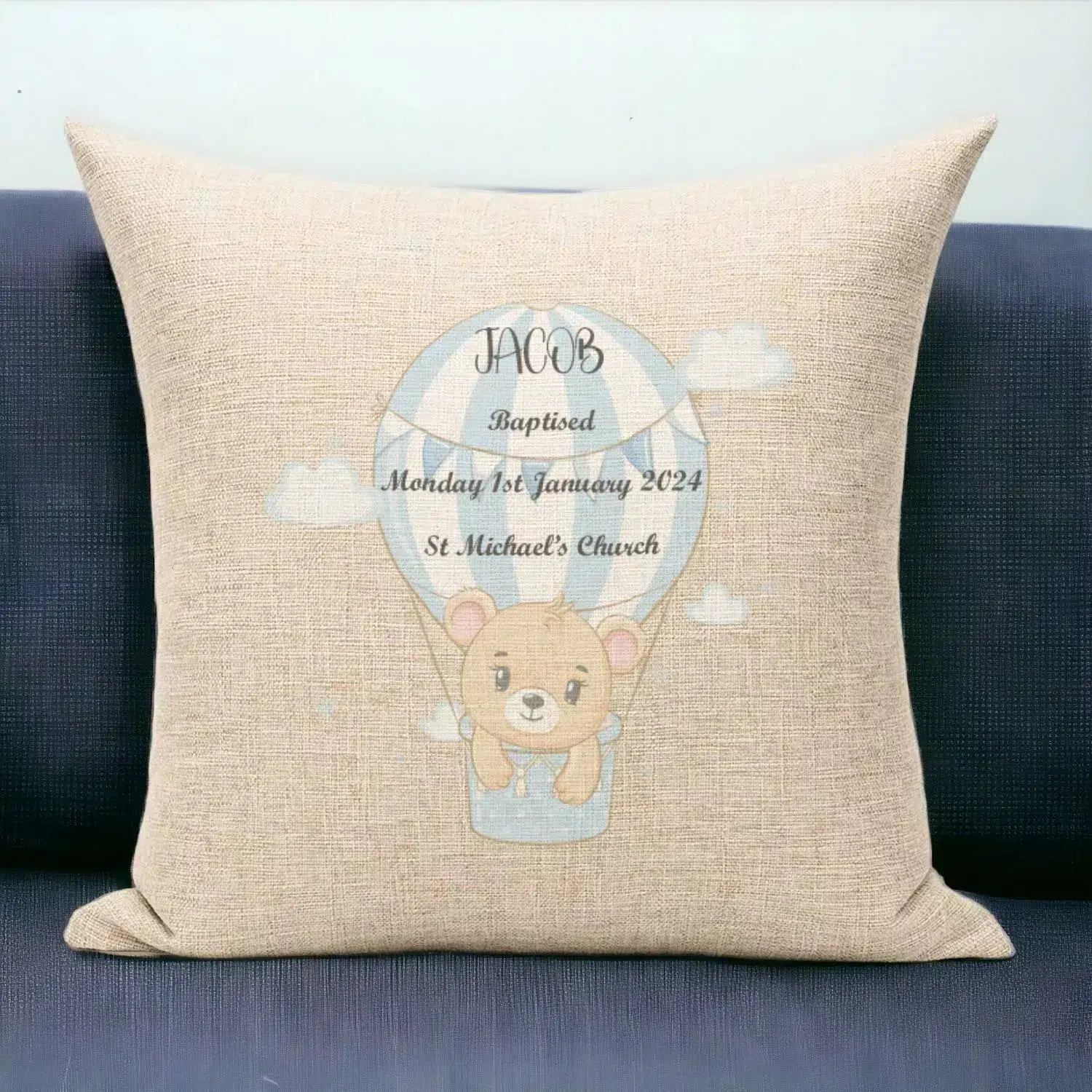 Personalised Cushion New Baby Boy Air Balloon Gift