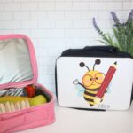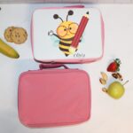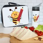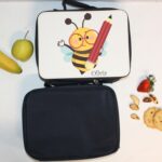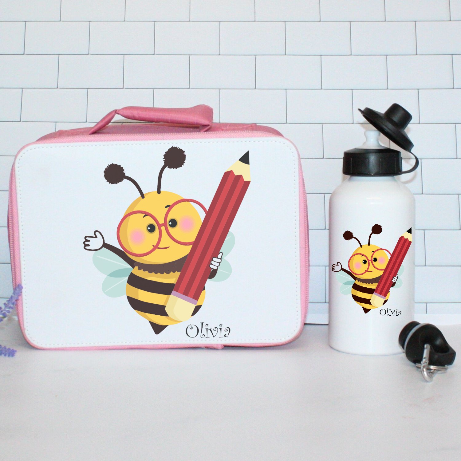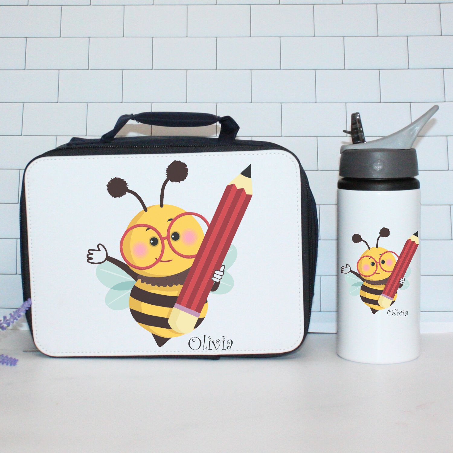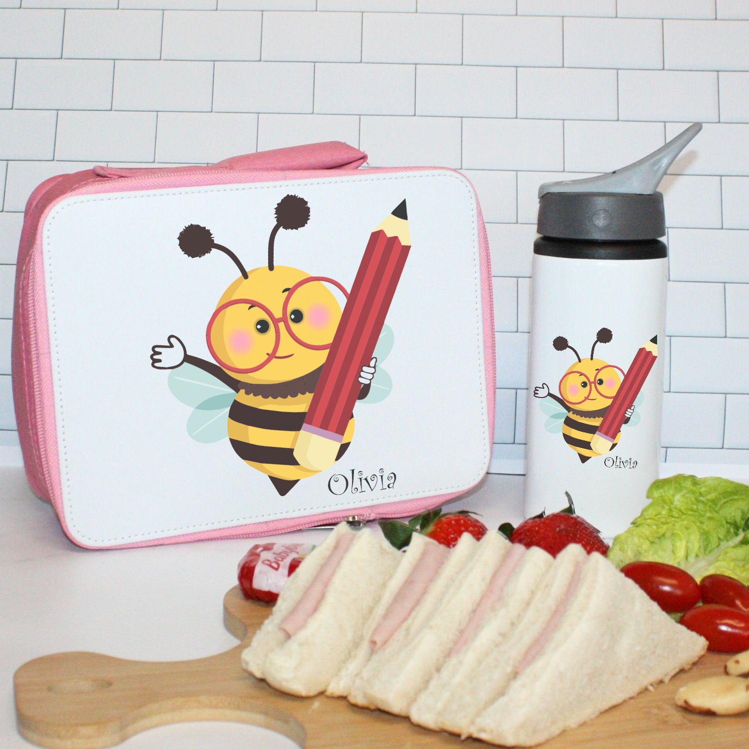 The front of the lunch box showcases a charming image of a cute bee wearing round glasses and holding a pencil, adding a playful, scholarly touch that kids will adore. There’s a dedicated spot at the side where you can personalise the lunch box with your child’s name, making it a special and unique item for the Back to School season.