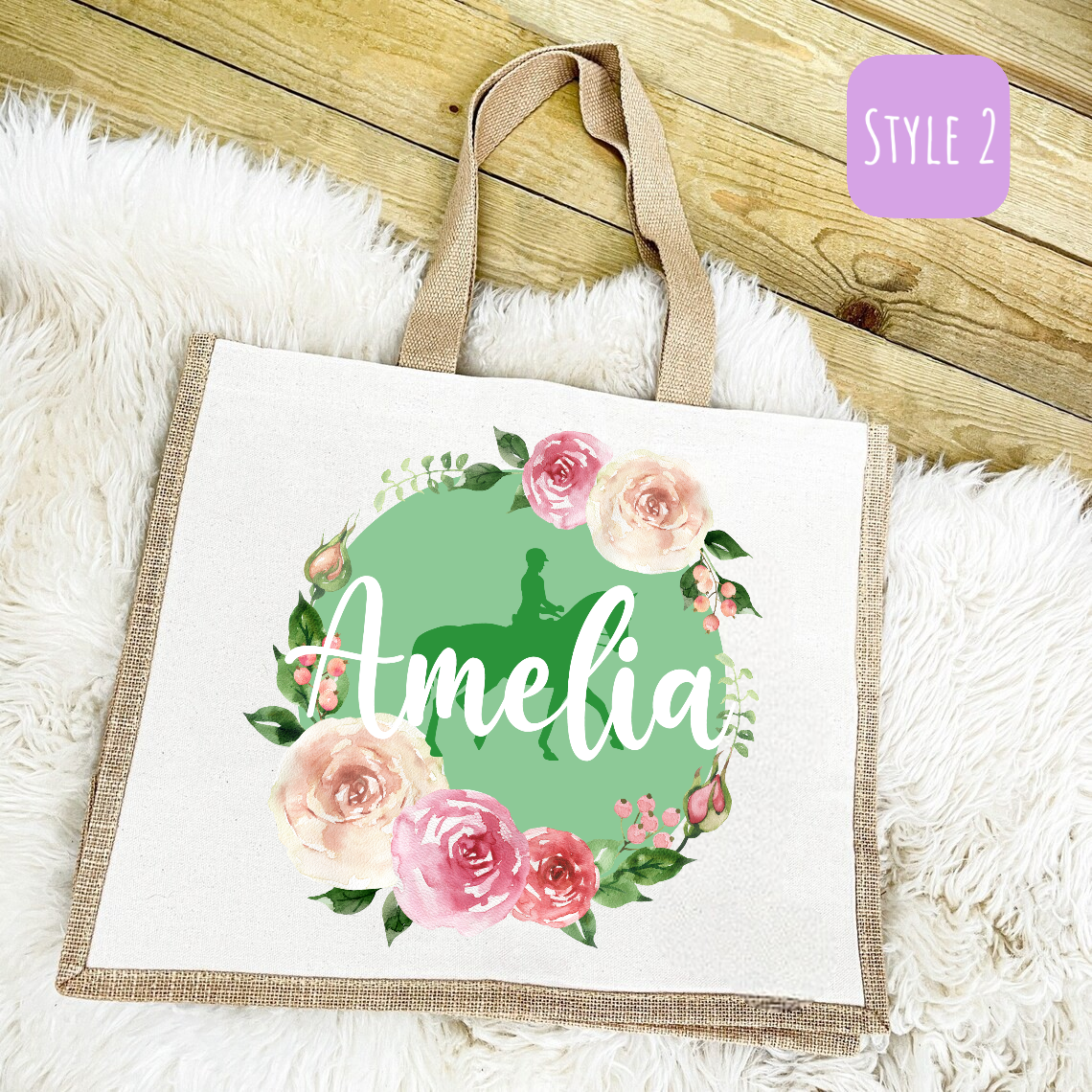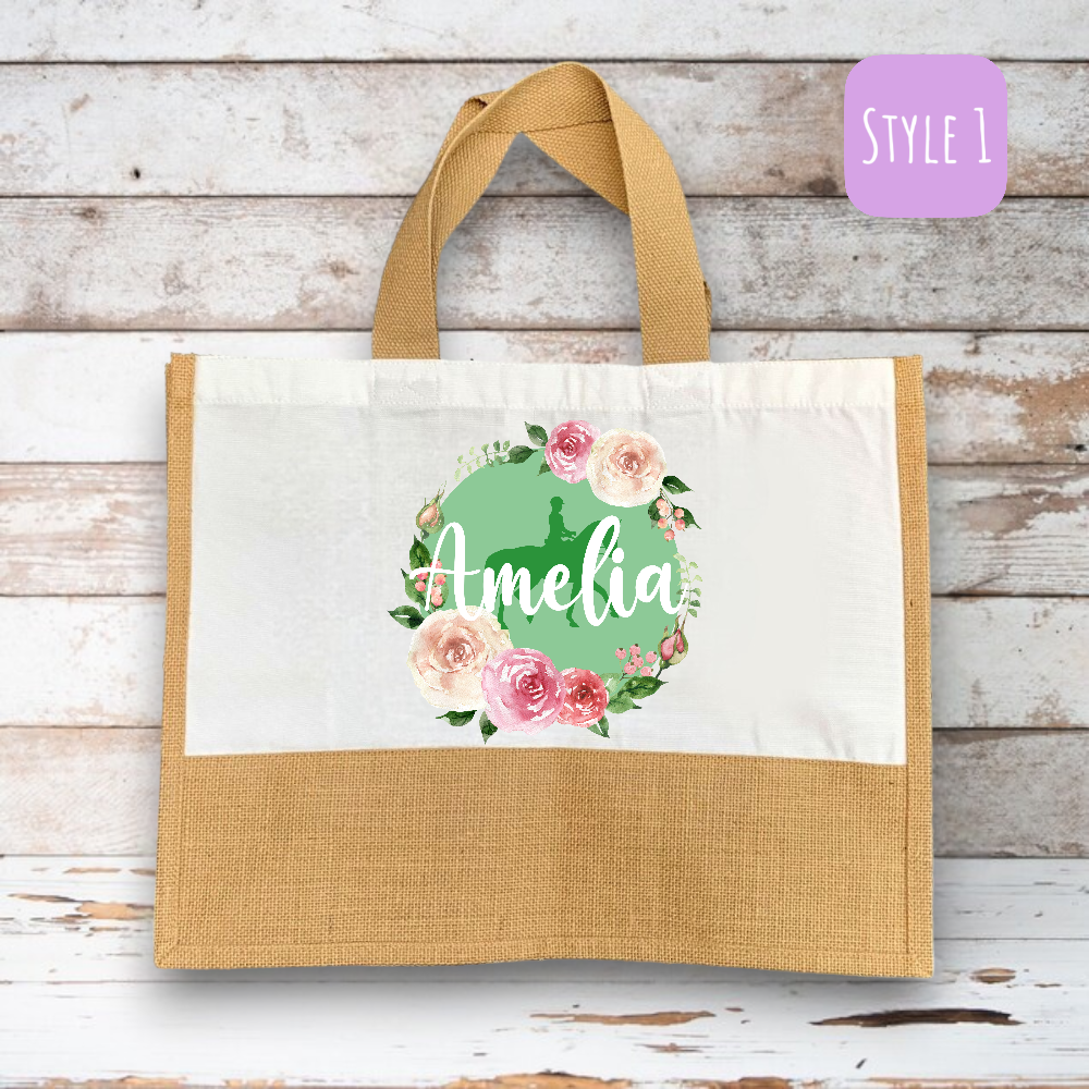 Introducing our eco-friendly and stylish Reusable Personalised ‘Horse & Rider in Flower Wreath’ Shopping Bag, thoughtfully crafted with a blend of natural jute and durable polyester, offering you the perfect fusion of sustainability and functionality. Designed to make a positive impact on the environment, this bag is a testament to our commitment to reducing single-use plastic waste.