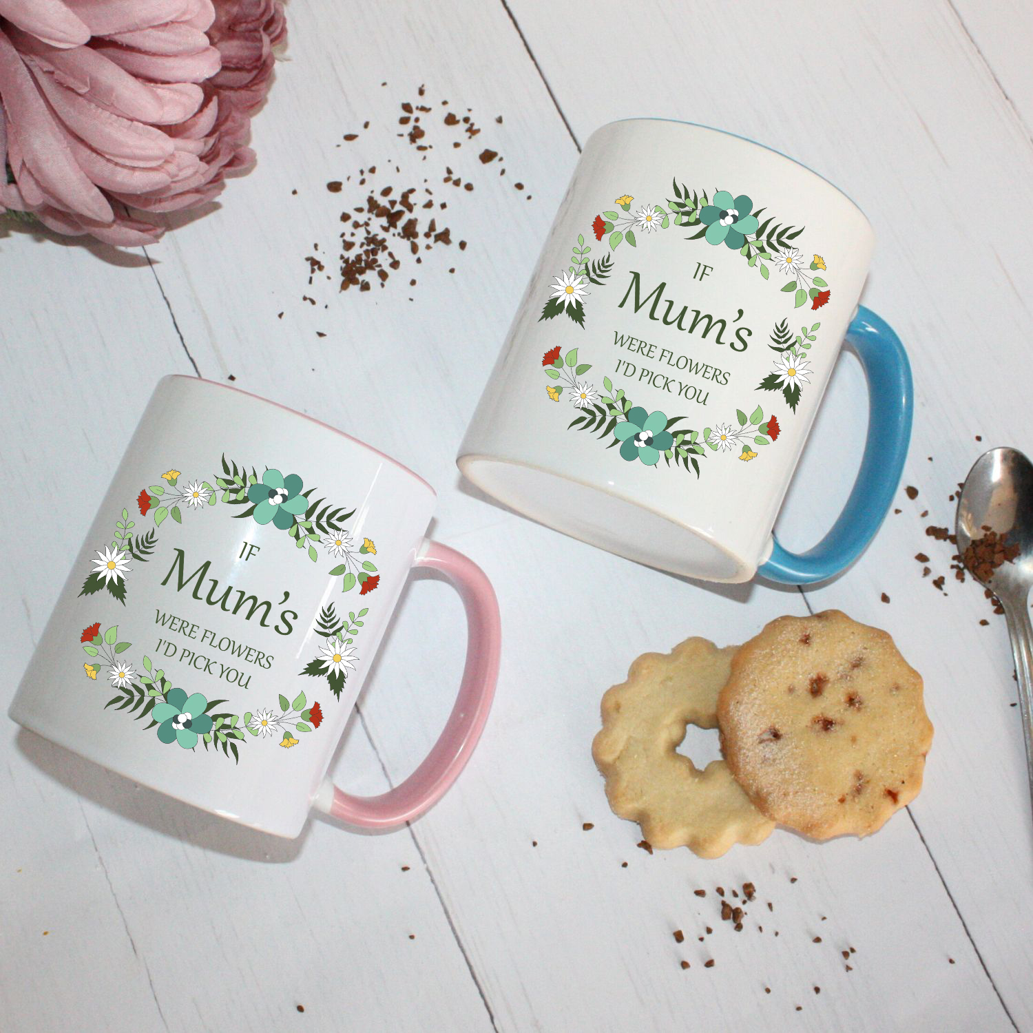 Celebrate the special mum in your life with our beautifully designed personalised mug, featuring a stunning flower wreath and the heartfelt caption, “If Mums Were Flowers I’d Pick You.” This exquisite custom mug is perfect for showing your appreciation and love on Mother’s Day, birthdays, or any occasion. Available in several styles, including a classic 11 oz mug, an elegant latte mug, and a generous 20 oz mug, you can choose between a charming pink-handled or a serene blue-handled design to perfectly suit her taste.