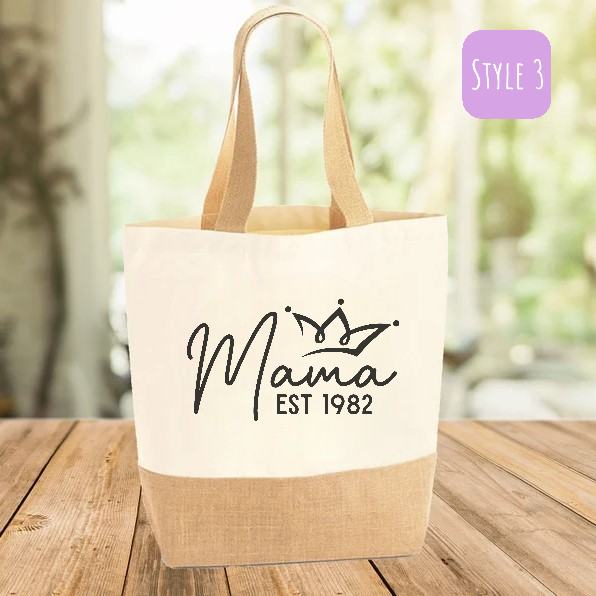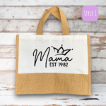 Introducing our eco-friendly and stylish Reusable Personalised ‘Mama Est [Year]’ Shopping Bag, thoughtfully crafted with a blend of natural jute and durable polyester, offering you the perfect fusion of sustainability and functionality. Designed to make a positive impact on the environment, this bag is a testament to our commitment to reducing single-use plastic waste.