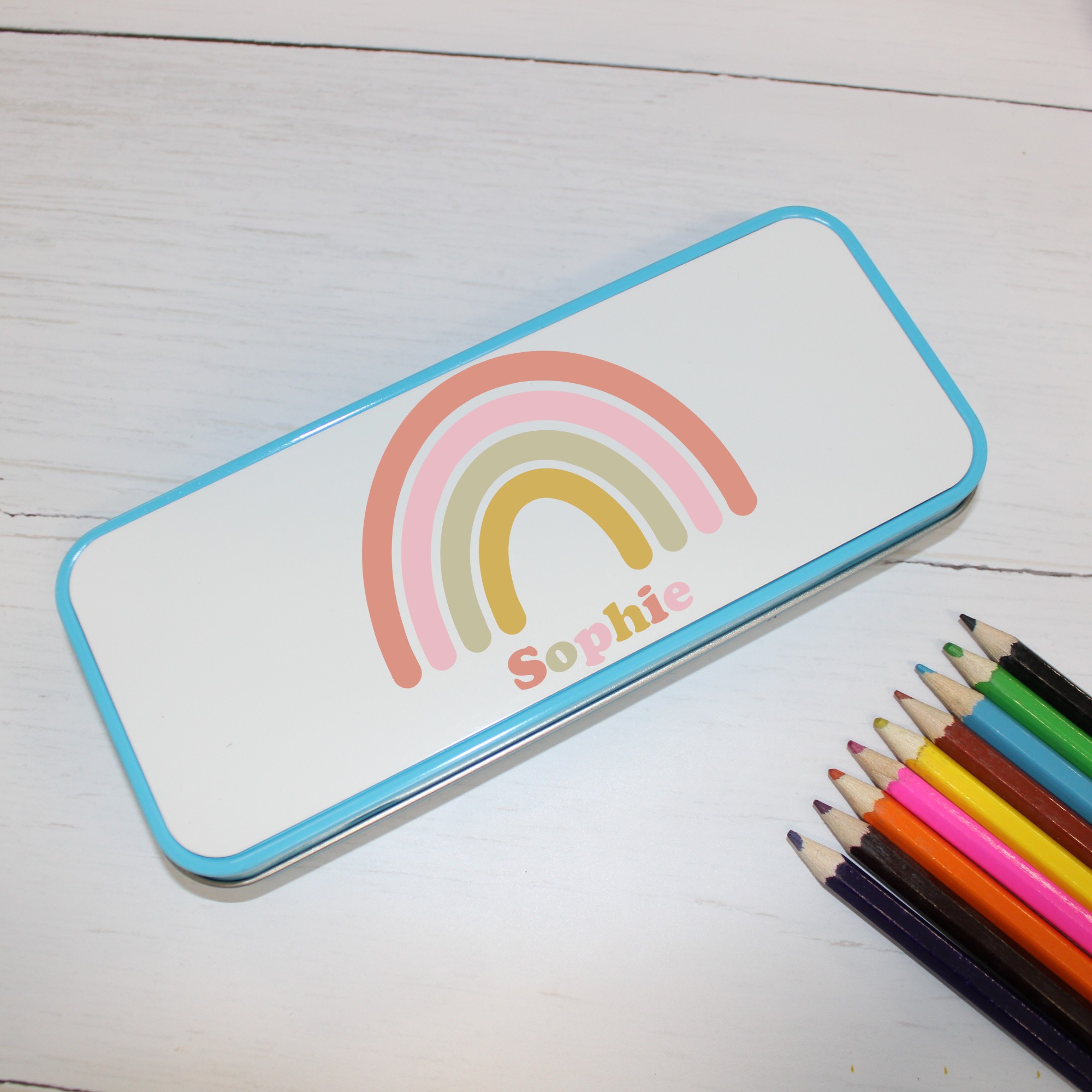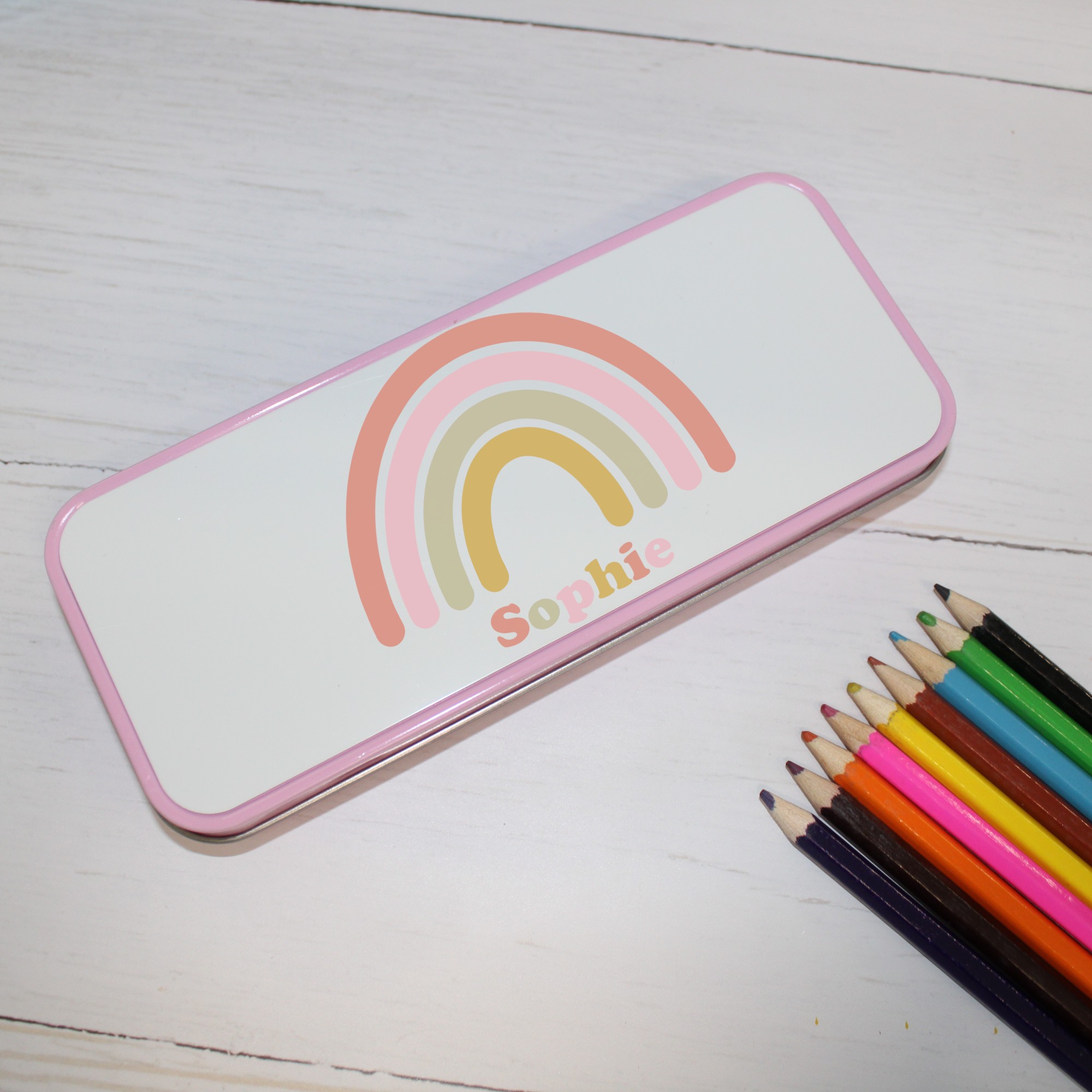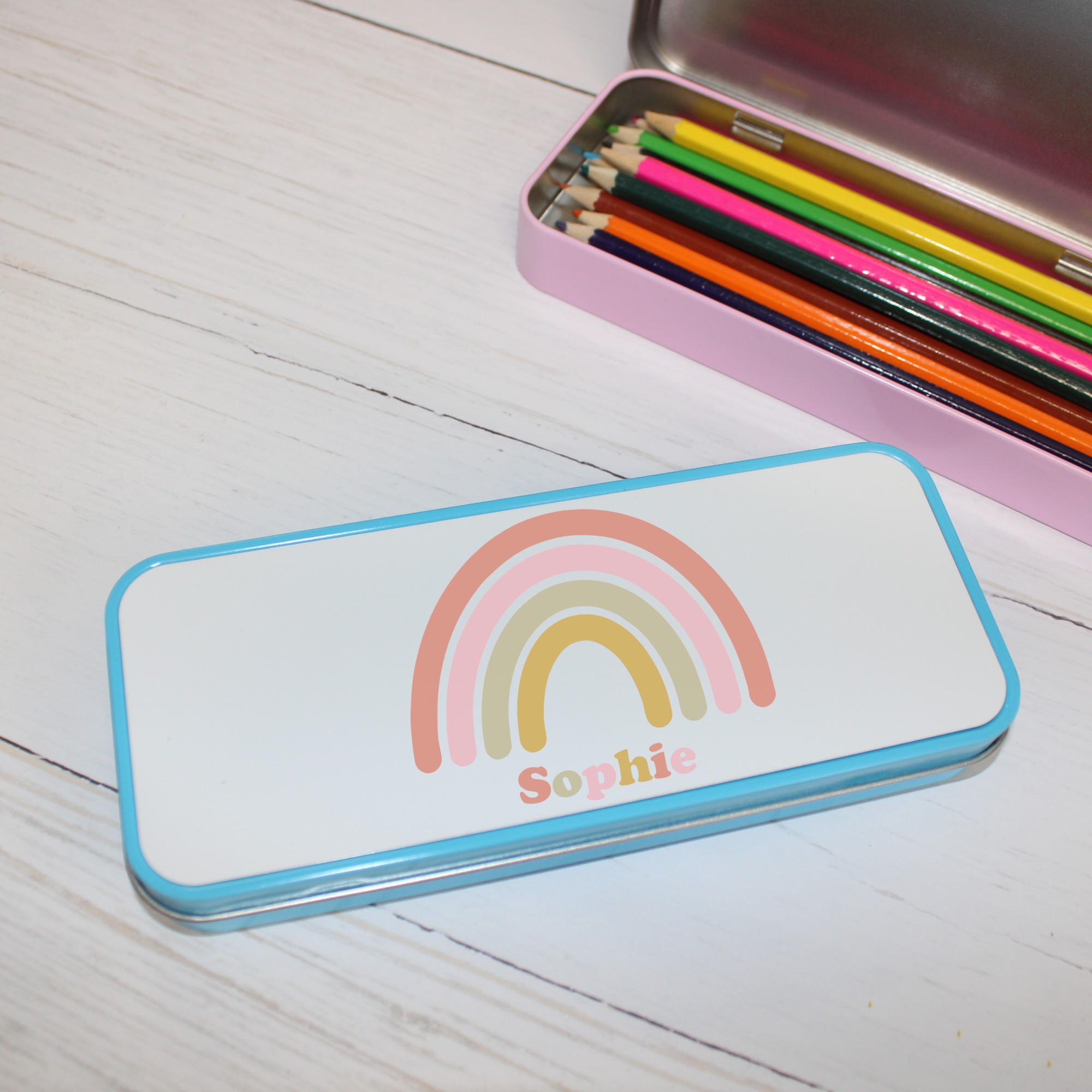 Personalised Metal Pencil Tin – Pastel Rainbow | Cute Crayon Pencil Case