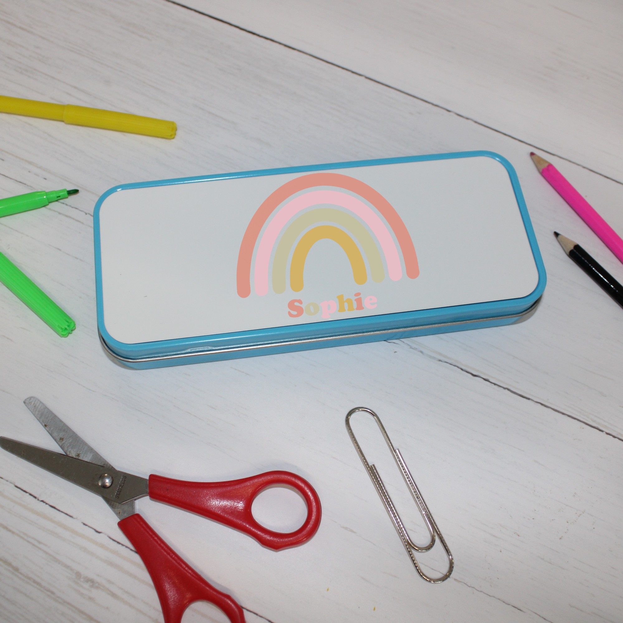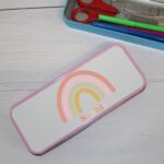 Introducing our Custom Child’s Tin, a personalized metal pencil case that adds a touch of soft, colorful elegance to any child’s school supplies. Measuring 18.5 x 7.5 x 2.3 cm, this durable and practical pencil case is perfect for keeping all your child’s writing essentials neatly organised. The exterior features a serene image of a rainbow in gentle pastel colors, creating a soothing and charming design. Personalise it with your choice of name to make it a truly unique and special gift.
