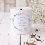 Personalised Money Box – Blue Hearts and Flowers