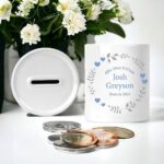 The timeless design features the baby’s name lovingly printed on the money box, adding a personal touch that makes it truly unique. With its elegant inscription, this coin keeper becomes a cherished memento that captures the essence of the special day of birth.