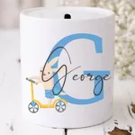 Introducing the Child’s Initial Coin Keeper – a delightful money box featuring the child’s initial and name inscribed within a whimsical rabbit on a scooter design. This charming creation combines practicality with personalised charm, making it a perfect addition to any child’s bedroom or playroom.