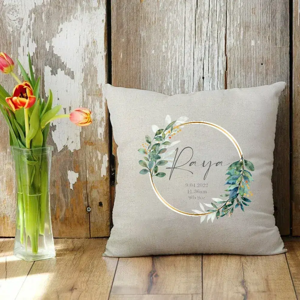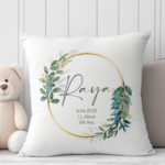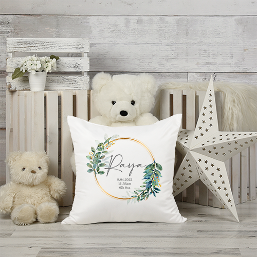 Hand Made With Love – Personalised Newborn Eucalyptus Wreath Cushion