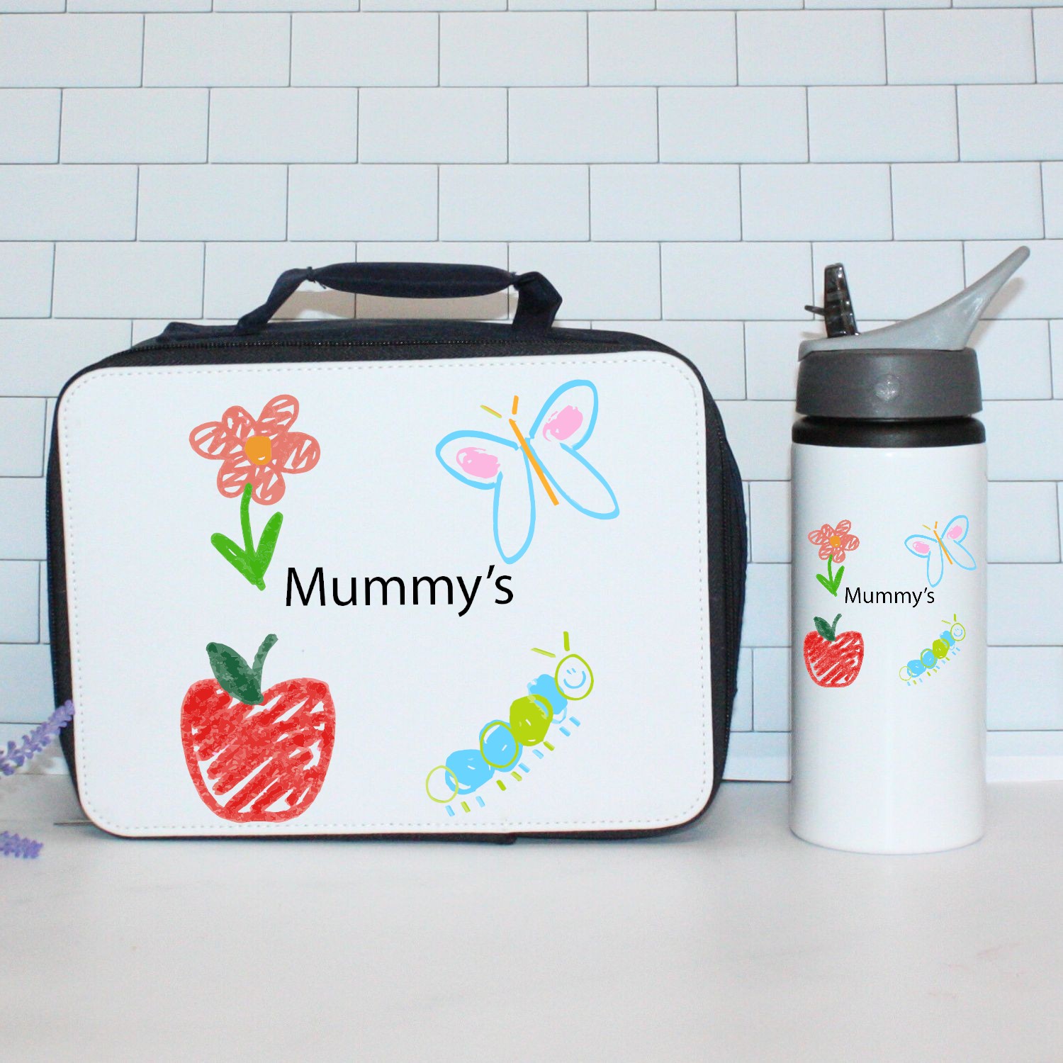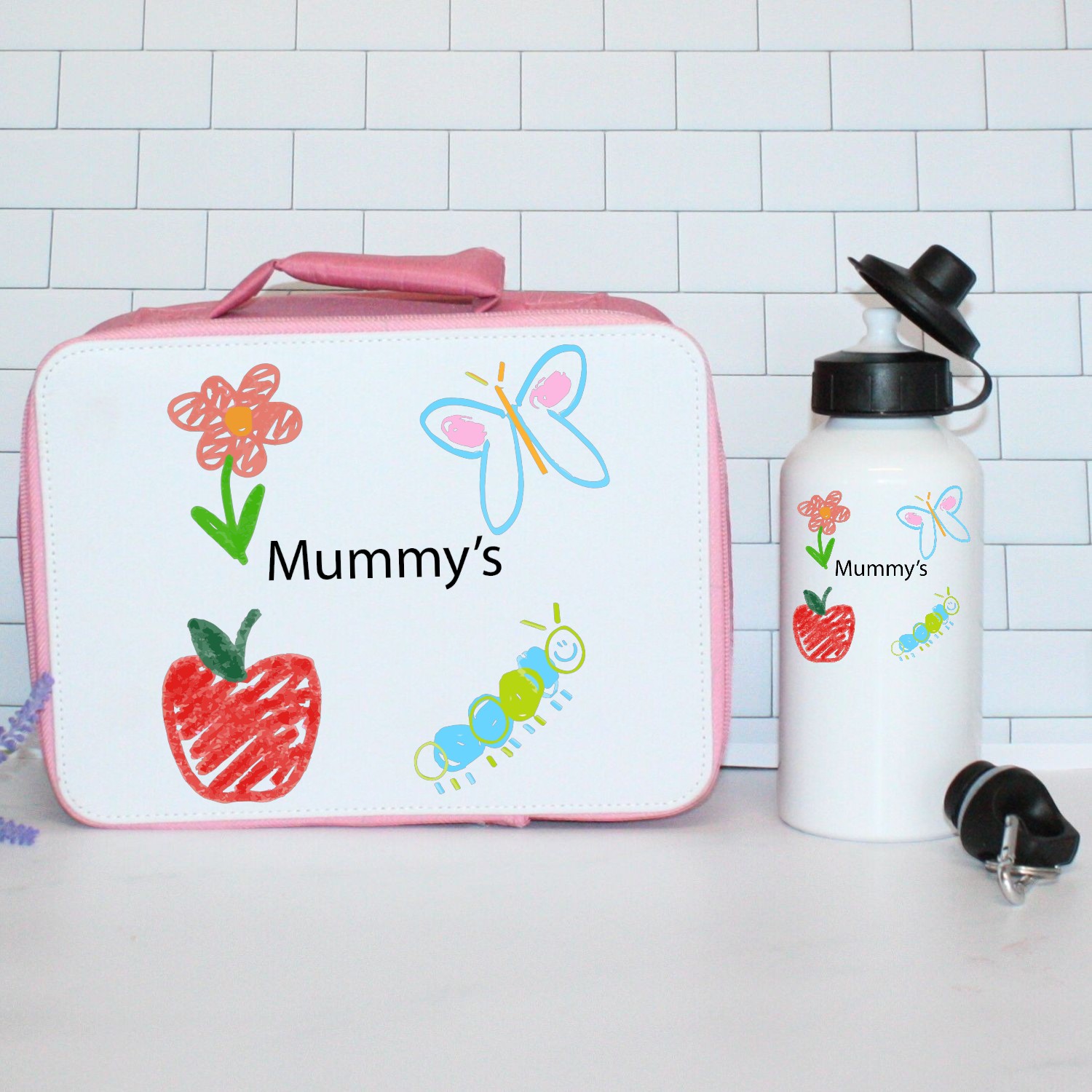 The front of the lunch box showcases a charming child-like sketch design featuring a butterfly, apple, caterpillar, and flower, adding a playful and creative touch that kids will love. To make it extra special, you can personalise the lunch box with your child’s name prominently displayed in the middle, making it a unique and thoughtful item for the Back to School season.