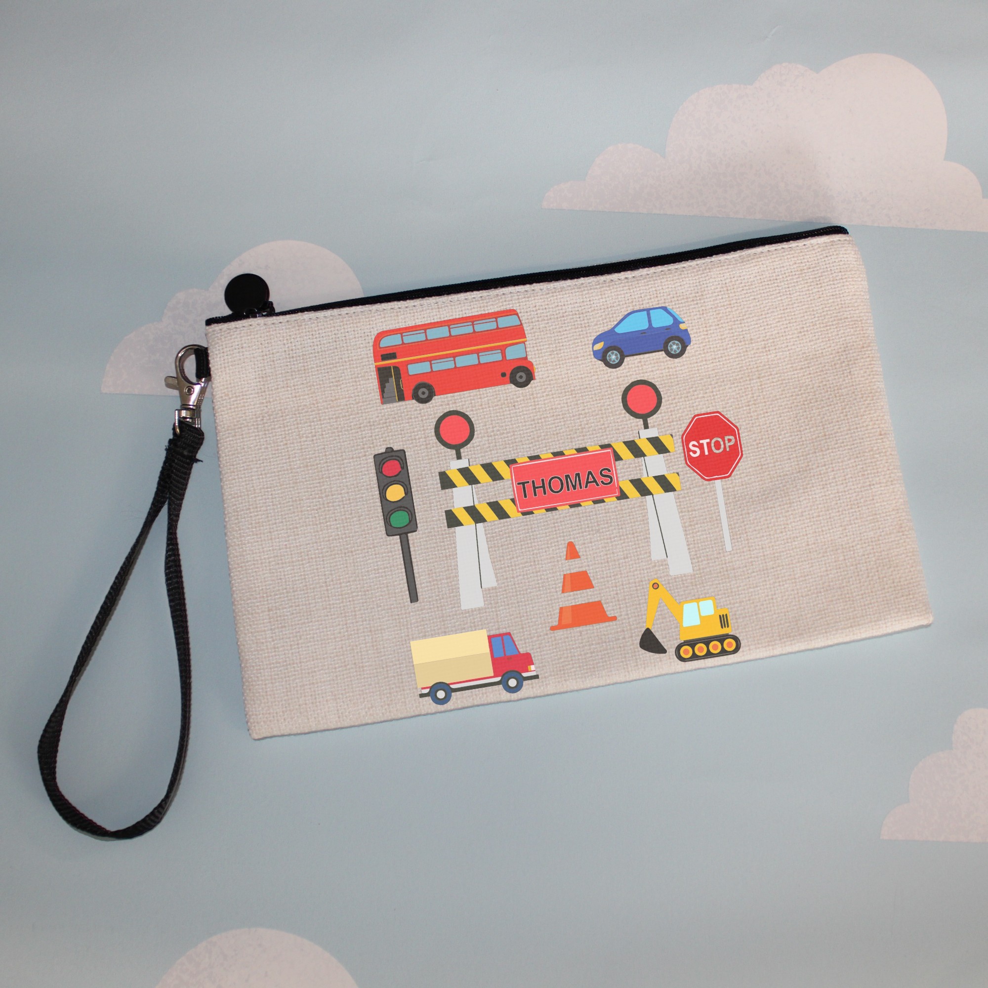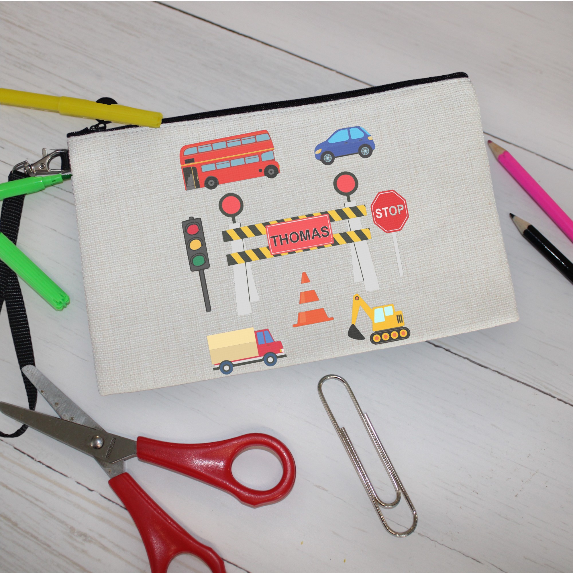 Get ready for the new school year with our Personalised Synthetic Pencil Case, perfect for kids going Back To School and teachers who love a touch of creativity! This Custom Pencil Case features a playful image of a traffic fence with a personalised name on the sign, surrounded by vibrant illustrations of a traffic light, stop sign, truck, digger, traffic cone, bus, and car. Measuring 15cm x 24cm, it offers ample Storage For School essentials like pencils, markers, and erasers, keeping everything neatly organised and easy to find.