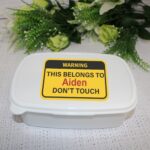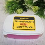 Keep lunchtime safe with this Personalised Lunch Box featuring a bold warning label design that reads, “This belongs to [Name] Don’t Touch.” Measuring 25 x 19 x 8 cm, this Custom Lunch Box is perfect for kids who like to make a statement. The striking design not only adds a touch of fun but also ensures that your child’s lunch is clearly marked and easily recognizable. Crafted from durable, BPA-free materials, this Child’s Lunch Box is built to keep food fresh and secure throughout the day. Ideal for school or daycare, this School Lunch Box combines practicality with a playful, personalised design, making it the ultimate Costum Lunch Box for your child’s daily adventures.