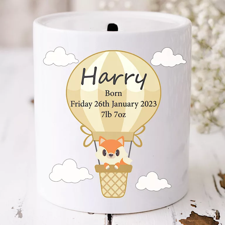 Personalised Air Balloon Money Box – Personalised Money Box – Woodland Money Box