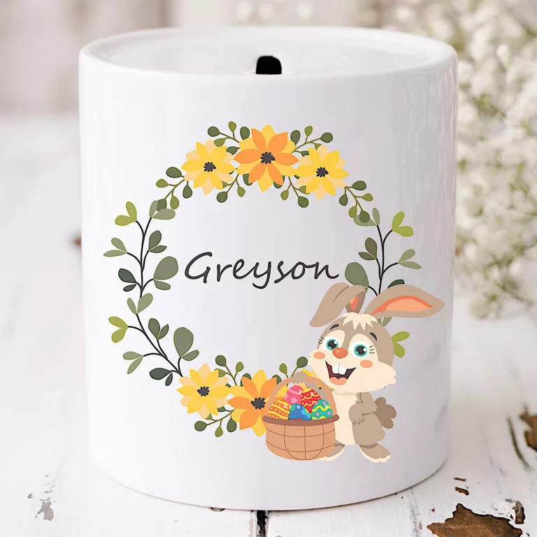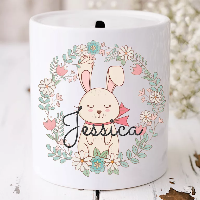 Personalised Money Box – Flopsy Rabbit Named – Bunny Gift – Custom Name