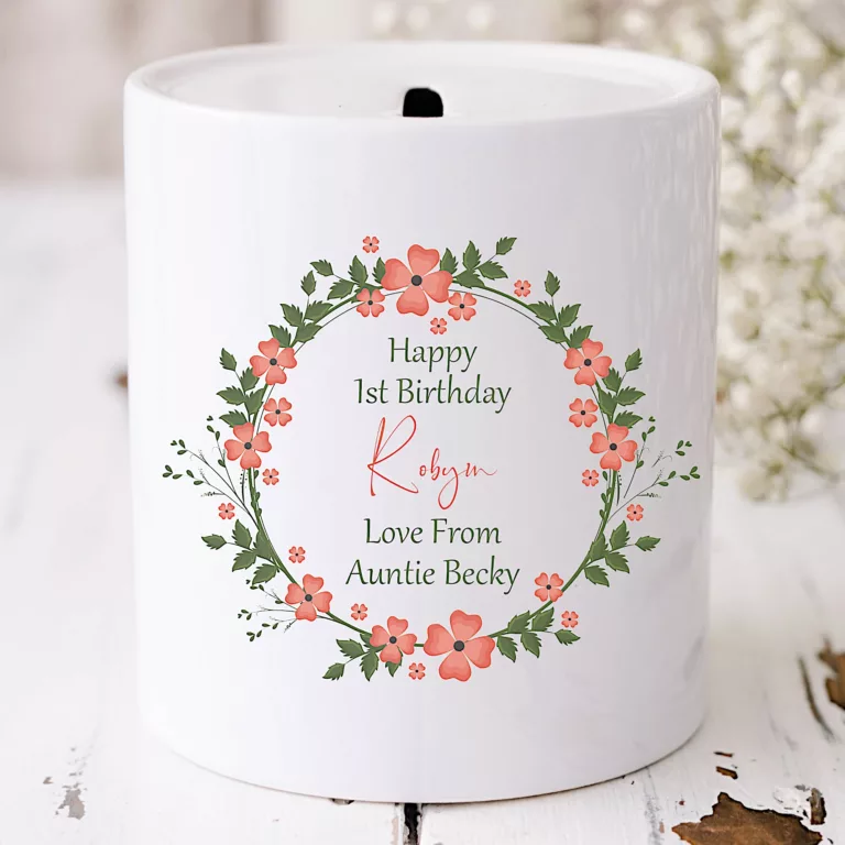 Personalised Money Box – 1st Birthday Wreath Gift – First Birthday Gift