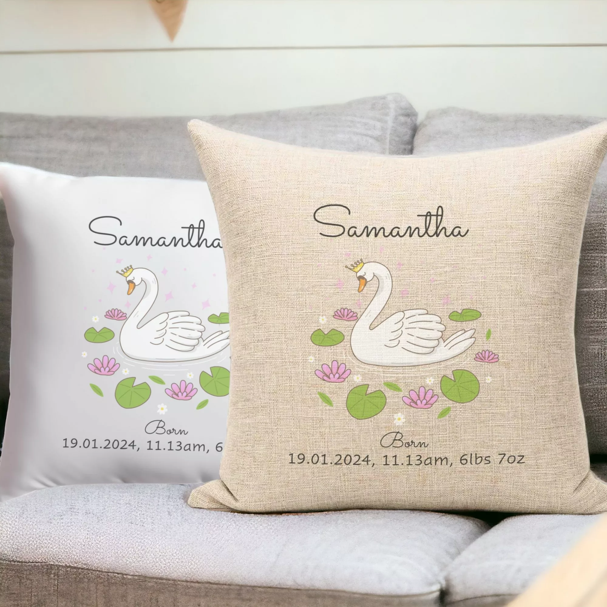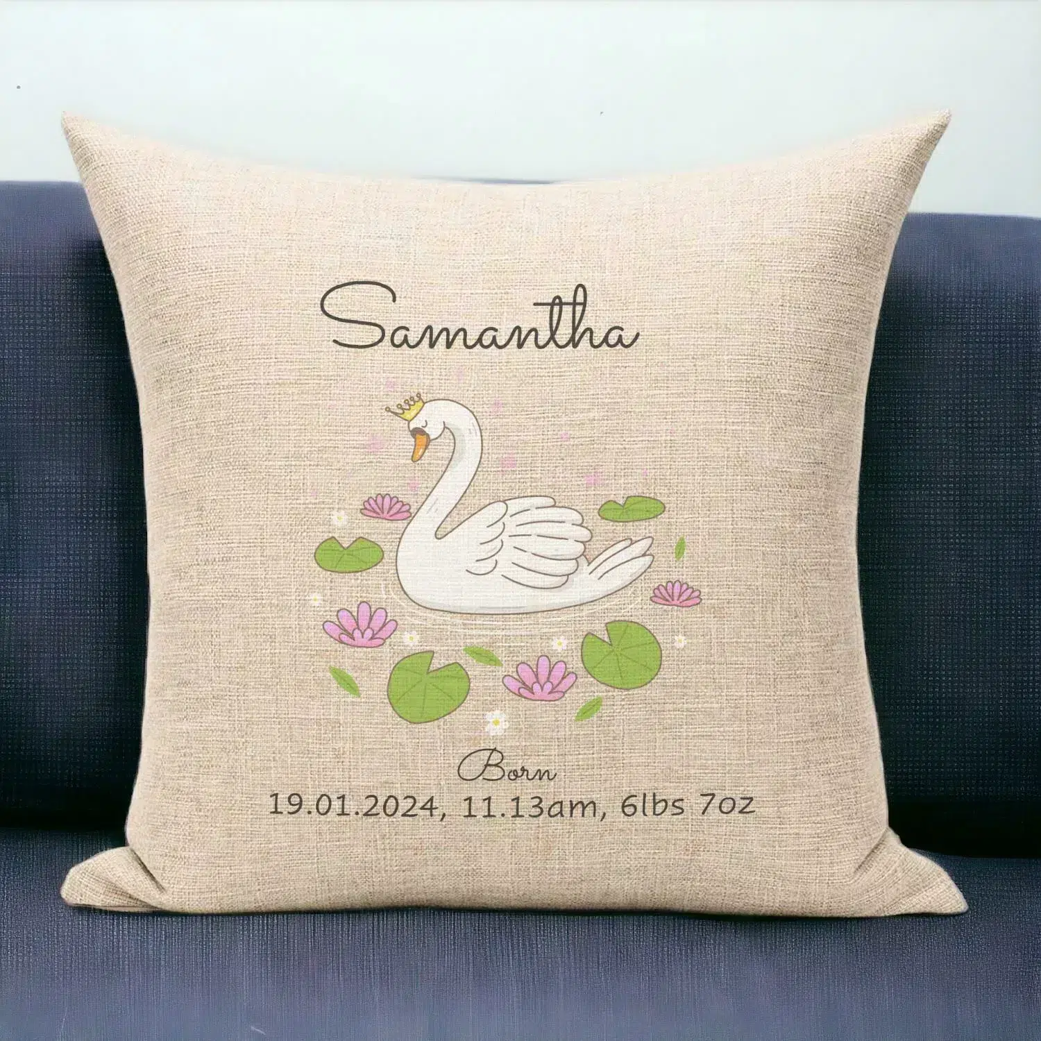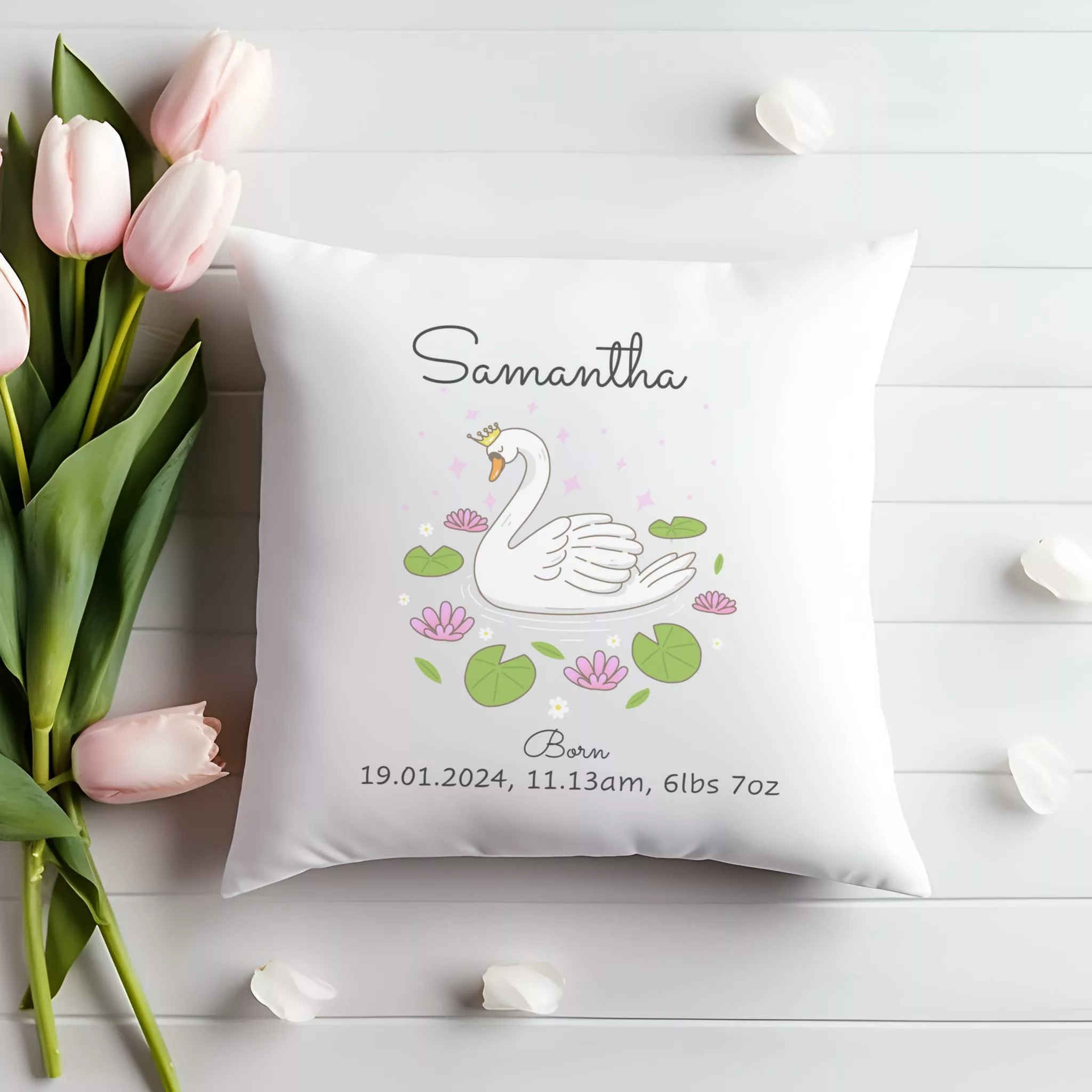 Personalised Cushion – New Born Baby Gift Swan in Wreath