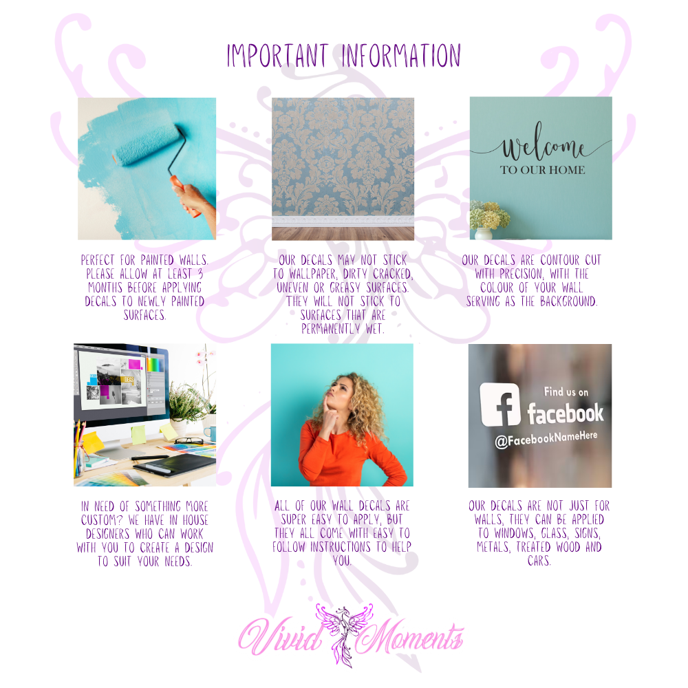 In The Personalisation Box – Please Enter: 1. Colour required from our colour chart (please use exact colour name) 2. If required – Reverse facing image to use on inside windows 3. Will be sent in Matt finish unless you specify Gloss (Generally matt looks much better on walls than gloss as its doesn’t reflect the light) You will receive: Decal with application tape ready applied. Comes in sections 1 x Installation Instructions. Tips for application